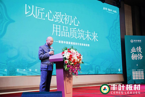 在《品牌布局》环节,丰叶板材副总经理、品牌运营负责人王赛红先生发表了题为《以匠心致初心,用品质筑未来》的演讲。他回顾了丰叶板材从1992年创业至今的奋斗历程,并分享了丰叶品牌的核心优势与未来战略。